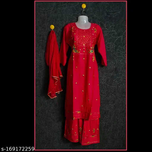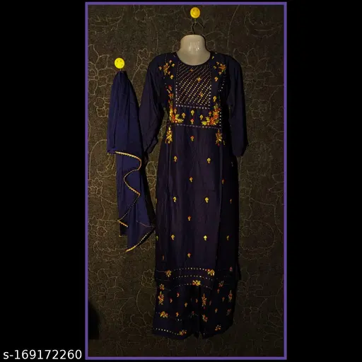 Top Fabric : Cotton Lining Fabric : No Lining Bottom Fabric : Cotton Dupatta Fabric : Cotton Pattern : Embroidered Net Quantity (N) : Single Cotton Suit with Plazo and Duppatta has good work and stitching Sizes : Semi Stitched (Top Bust Size : Up To 20 m, Top Length Size: 42 m, Bottom Length Size: 1.5 m, Dupatta Length Size: 2 m)