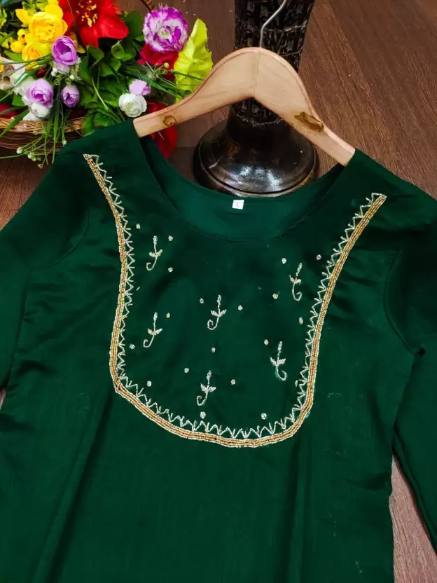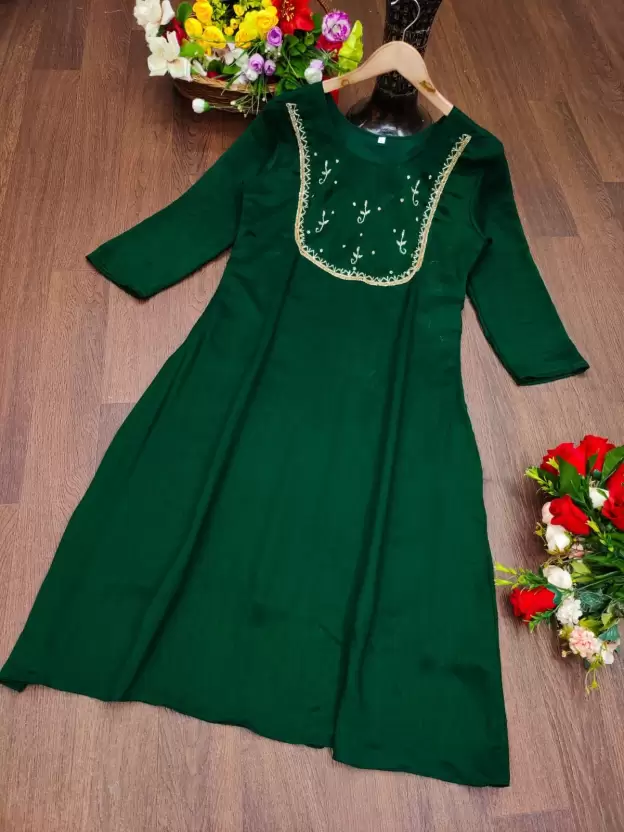 Color Dark Green Length Ankle Length Fabric Silk Pattern Embroidered Ideal For Women Type A-line Suitable For Western Wear Sleeve Length 3/4 Sleeve Neck Round Neck Fabric Care Regular Machine Wash Lining Material Cotton Creap Sleeve Regular Sleeves