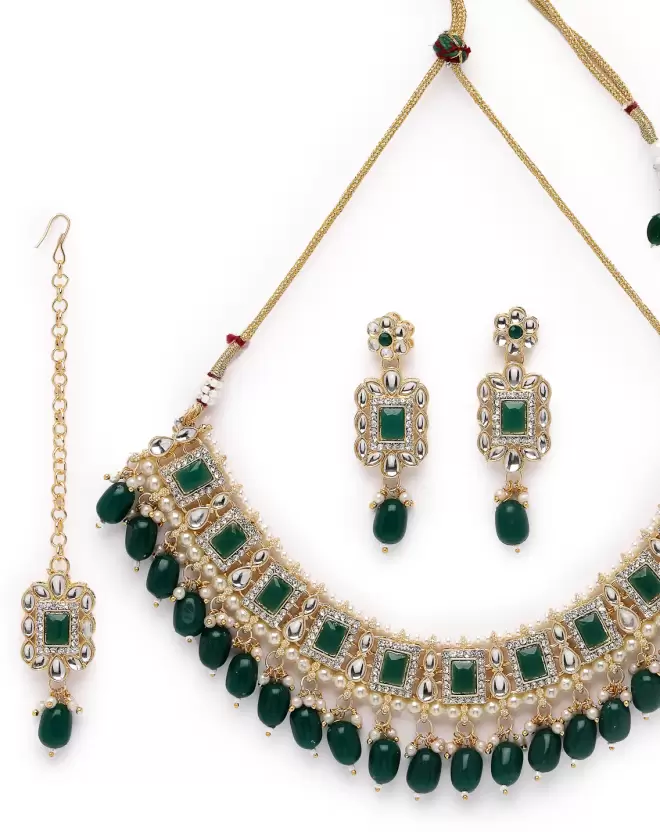 Base Material: Alloy Color: Green Type: Necklace, Earring & Maang Tikka Set Ideal For: Women Plating: Gold-plated Net Quantity:4 Sales Package: 1 Necklace, 1 Pair of Earring, 1 Maangtikka